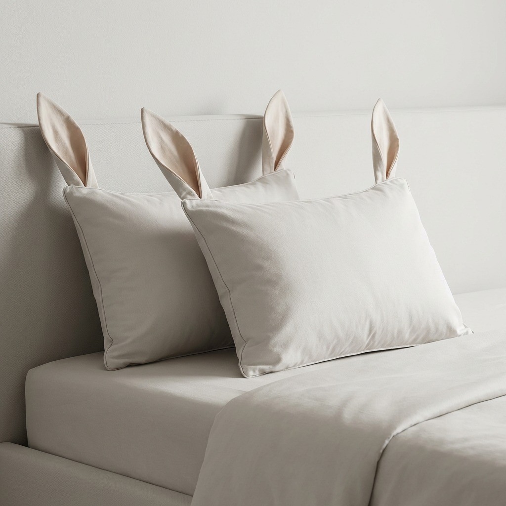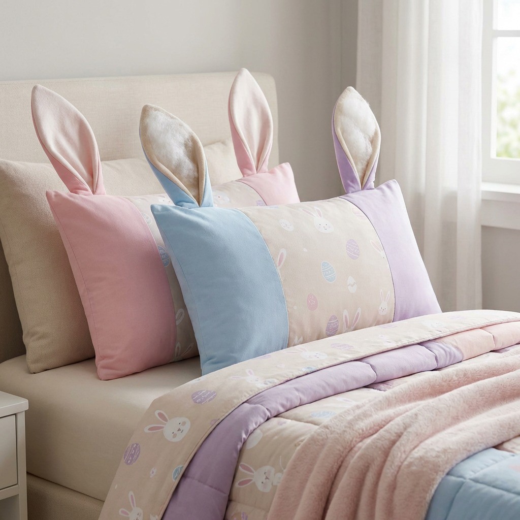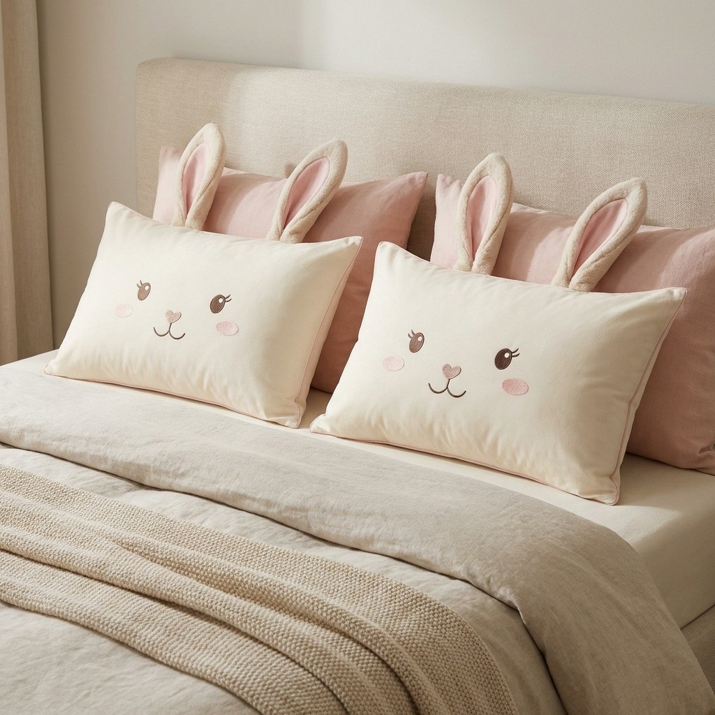 A criança entra no quarto e encontra uma cama temática, com orelhinhas de coelho “saltando” do travesseiro.