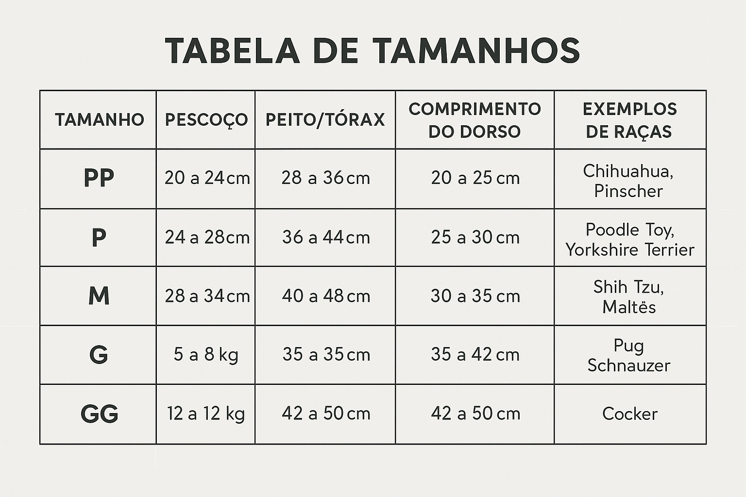 Tamanhos variados: do PP ao G1