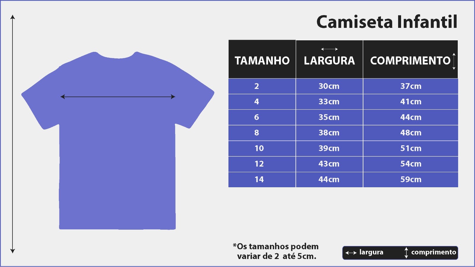*Use a Fita Métrica para medir sua camiseta e comparar com nossa tabela